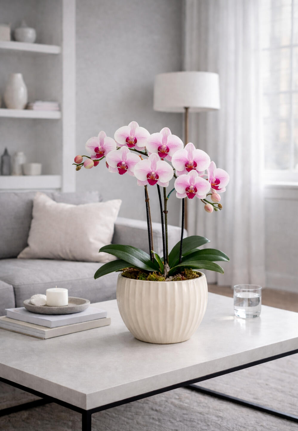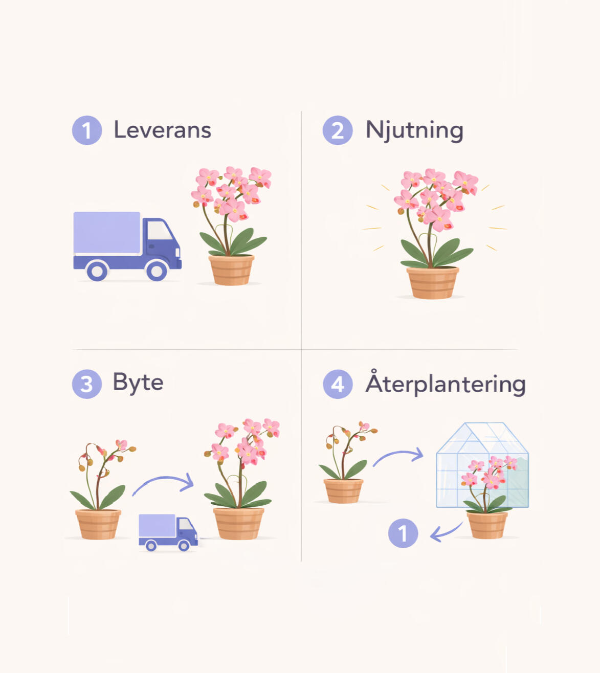 1. Vi levererar – En blommande orchideé i designerkruka kommer till din dörr.2. Du njuter – Upplev 8–10 veckor av peak-skönhet med minimal skötsel (enkel vattning).3. Vi byter ut – Innan sista blomman vissnar byter vi den mot en ny, färsk blomning.4. Vi återplanter – Plantor som tappat sina blommor återförs till våra partners växthus för professionell återhämtning och ny blomning.
